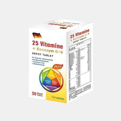 磷酸氫鈣、羥丙基甲基纖維素、氧化鎂、微結晶纖維素、維生素C、氯化鉀、丁烯二酸亞鐵、維生素E、菸鹼醯胺、柑橘生物類黃酮、硫酸鋅、硬脂酸鎂、聚乙烯吡咯烷酮、D-山梨醇、泛酸鈣、硫酸錳、輔酵素Q10、二氧化鈦、維生素B12、維生素B6、硫酸銅、羥丙基纖維素、維生素B2、維生素B1、硬脂酸、滑石粉、乙酸視黃酯、鉬酸鈉、氧化鐵、葉酸、三氯化鉻、維生素K1、亞硒酸鈉、生物素、維生素D3